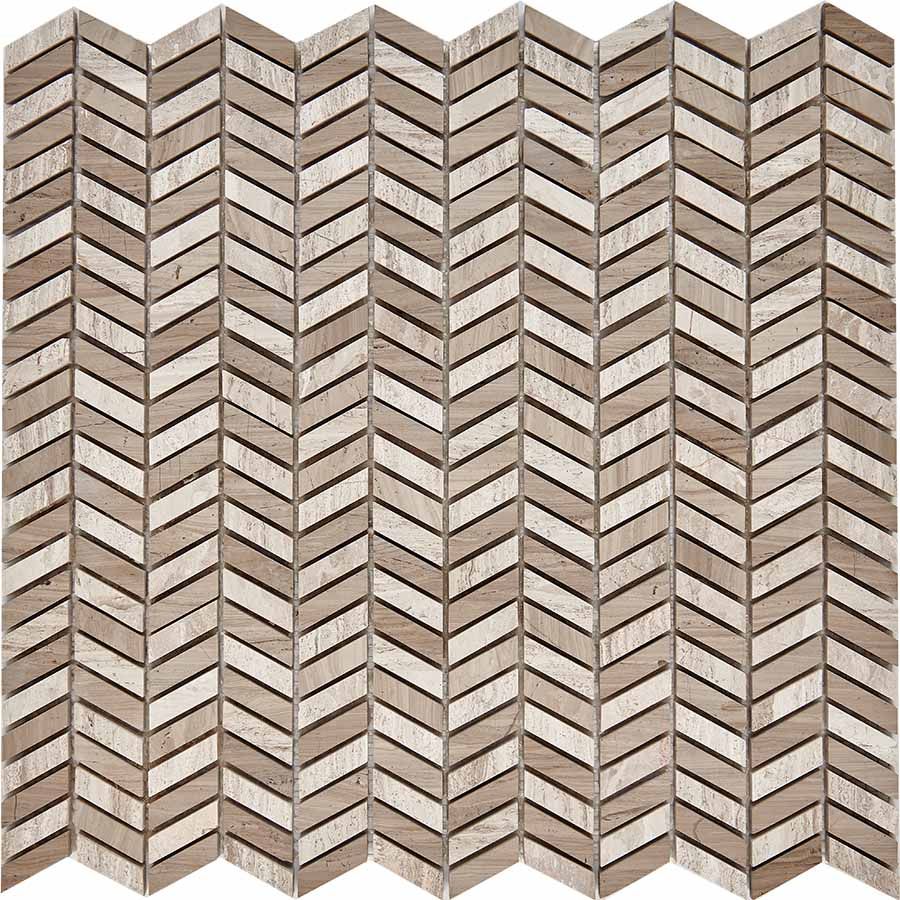Мозаика из мрамора Shevron White Wooden, Athens Grey PIX288, чип 27x10 мм, сетка 298х307x8 мм глянцевая, бежевый
