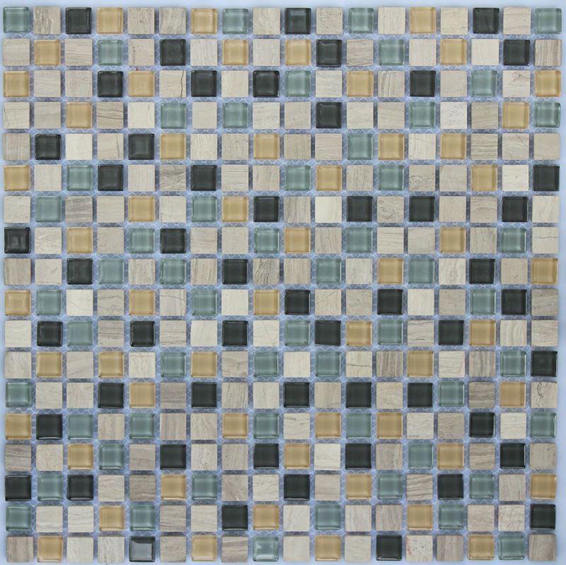 Мозаика S-851 стекло камень 30.5х30.5 см глянцевая чип 15х15 мм, бежевый, бирюзовый, коричневый
